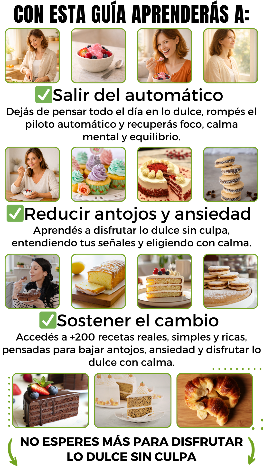 El proceso te acompaña a reducir antojos y consumo automático, entender tus señales y volver a disfrutar lo dulce sin culpa ni descontrol.